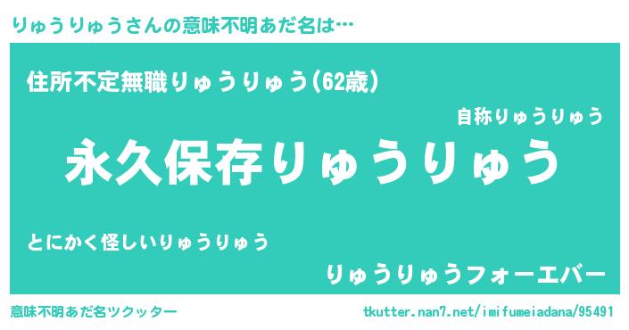 | 胡散臭い通販商品みたいなあだ名 | 『来世でも幸せになれる水素水…その名も「りゅうりゅう」』 |