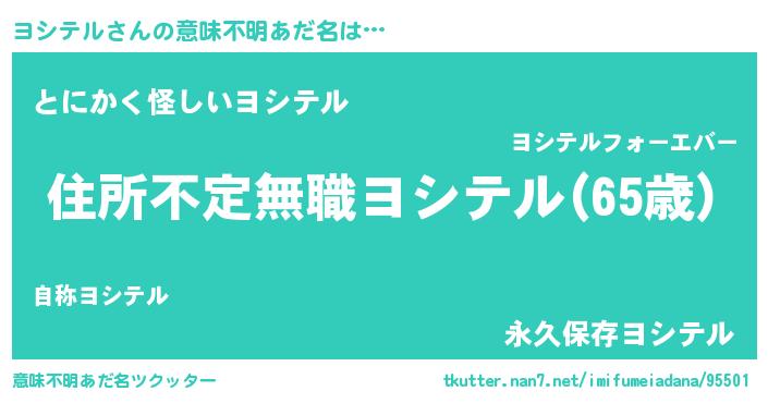 | 男性向けラノベタイトル風あだ名 | 『ヨシテルに滅ぼされるだけの簡単なお仕事です』 |