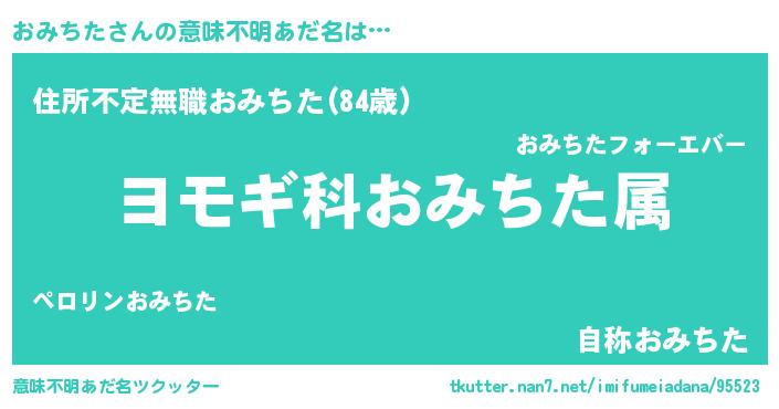 | 男性向けラノベタイトル風あだ名 | 『おみちた~年齢イコール彼女いない歴の魔法使い~』 |