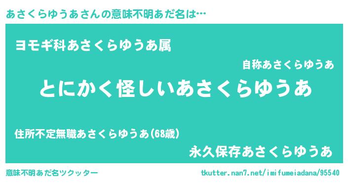 | 女子向けラノベタイトル風あだ名 | 『あさくらゆうあの卵を拾いまして』 |