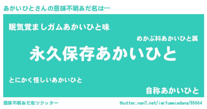 | 男性向けラノベタイトル風あだ名 | 『あかいひとという概念が存在しない退屈な世界 』 |