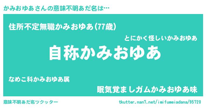 | 男性向けラノベタイトル風あだ名 | 『Re:かみおゆあから始める異世界生活』 |