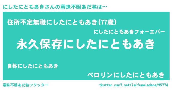 | ヘコむあだ名 | 『にしたにともあき(遠い目)』『にしもー』 |