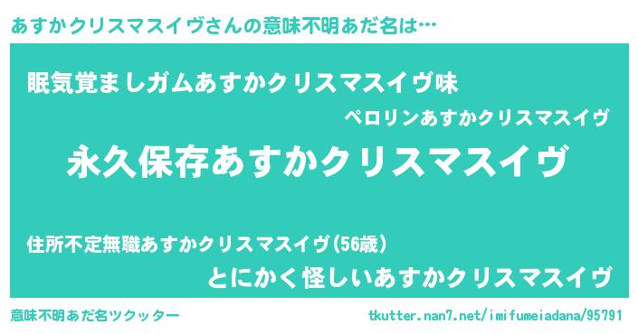 | 男性向けラノベタイトル風あだ名 | 『あすかクリスマスイヴという概念が存在しない退屈な世界 』 |