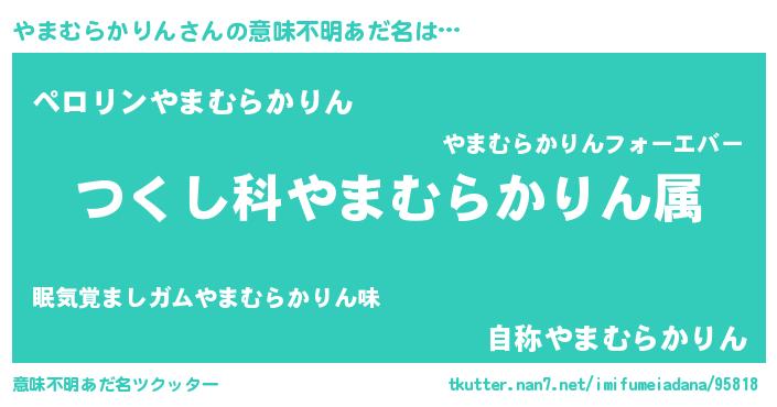 | 男性向けラノベタイトル風あだ名 | 『やまむらかりん~年齢イコール彼女いない歴の魔法使い~』 |