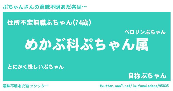 | 男性向けラノベタイトル風あだ名 | 『プチャンスレイヤー』『ぷちゃんの憂鬱』 |