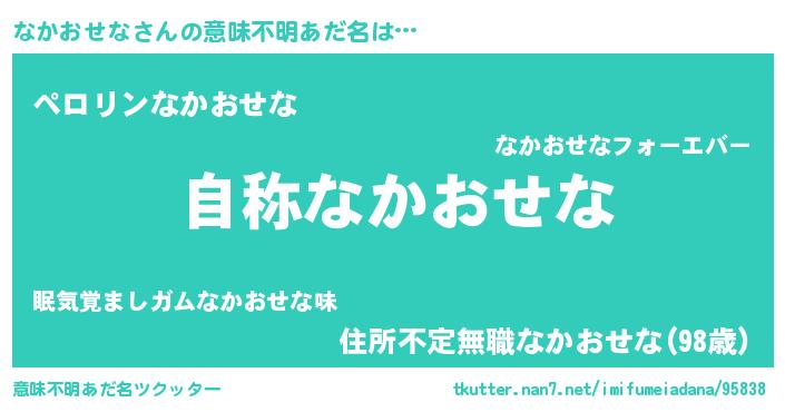 | 男性向けラノベタイトル風あだ名 | 『Re:なかおせなから始める異世界生活』 |