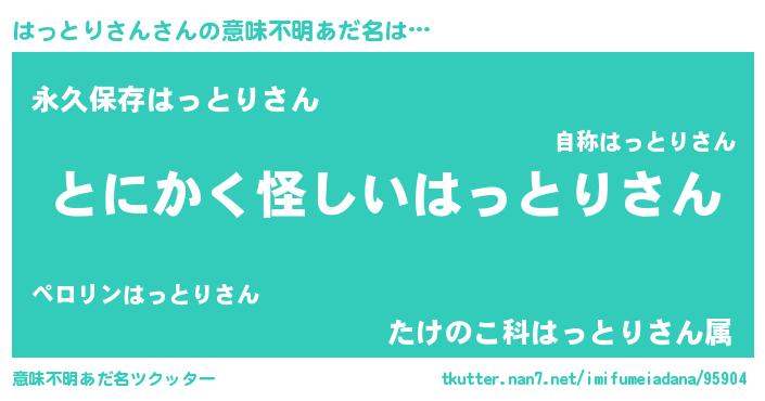 | 男性向けラノベタイトル風あだ名 | 『ダンジョンにはっとりさんを求めるのは間違っているだろうか』 |