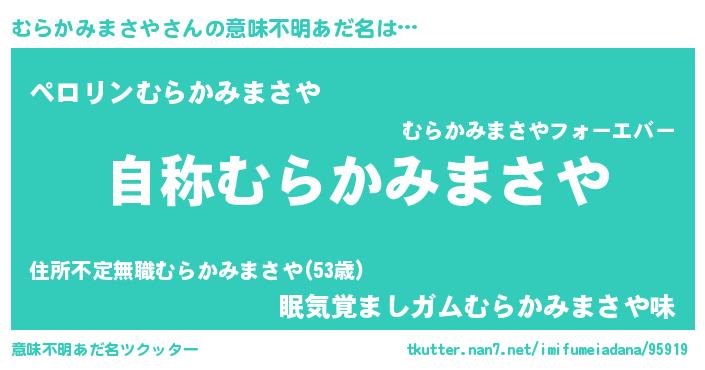 | 男性向けラノベタイトル風あだ名 | 『冴えないむらかみまさやの育てかた』 |