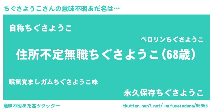 | 男性向けラノベタイトル風あだ名 | 『この素晴らしい世界にちぐさようこを!』 |
