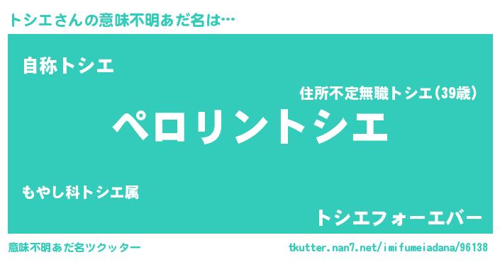 | 男性向けラノベタイトル風あだ名 | 『うちのトシエが世界を掌握している!』 |