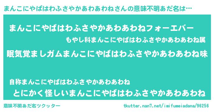 | 男性向けラノベタイトル風あだ名 | 『おまえをオタクにしてやるから、俺をまんこにやばはわふさやかあわあわねにしてくれ! 』 |