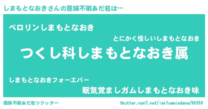 | 男性向けラノベタイトル風あだ名 | 『しまもとなおき~年齢イコール彼女いない歴の魔法使い~』 |