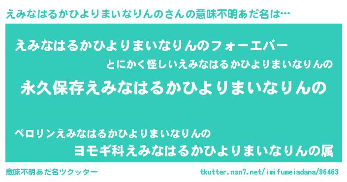 | ヒーロー風カッコイイあだ名 | 『ネオエミナハルカヒヨリマイナリンノ』 |