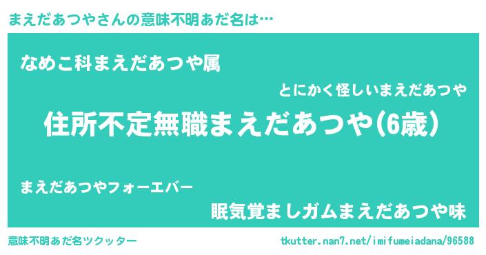 | 男性向けラノベタイトル風あだ名 | 『魔弾の王とまえだあつや』 |