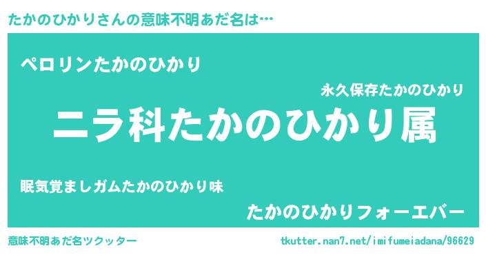 | 男性向けラノベタイトル風あだ名 | 『たかのひかり~年齢イコール彼女いない歴の魔法使い~』 |