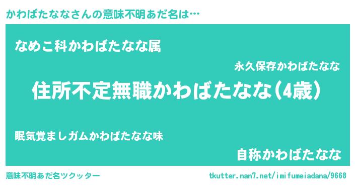 | 男性向けラノベタイトル風あだ名 | 『この素晴らしい世界にかわばたななを!』 |