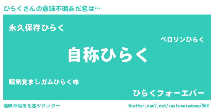 | 男性向けラノベタイトル風あだ名 | 『Re:ひらくから始める異世界生活』 |