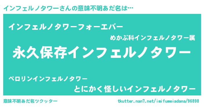 | 男性向けラノベタイトル風あだ名 | 『インフェルノタワーという概念が存在しない退屈な世界 』 |