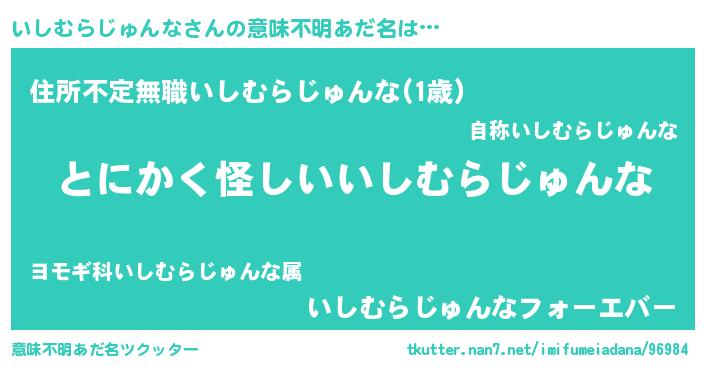| 男性向けラノベタイトル風あだ名 | 『いしむらじゅんなに滅ぼされるだけの簡単なお仕事です』 |