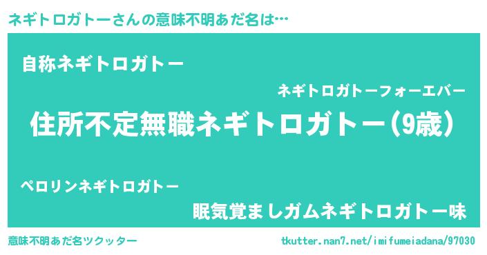 | 男性向けラノベタイトル風あだ名 | 『魔弾の王とネギトロガトー』 |
