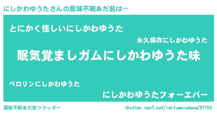 | 男性向けラノベタイトル風あだ名 | 『おまえをオタクにしてやるから、俺をにしかわゆうたにしてくれ! 』 |