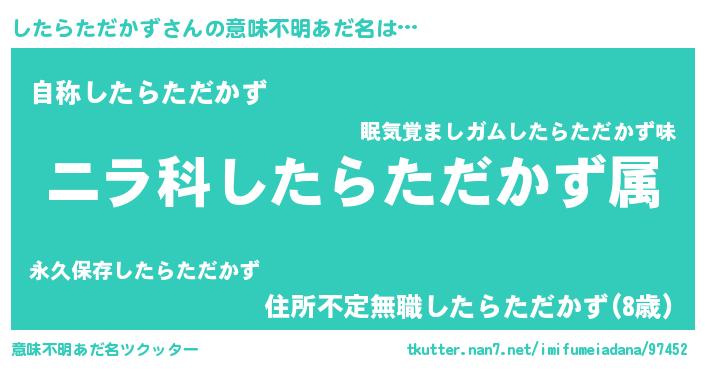 | 男性向けラノベタイトル風あだ名 | 『したらただかず~年齢イコール彼女いない歴の魔法使い~』 |