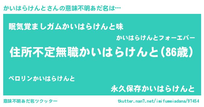 | ヘコむあだ名 | 『かいはらけんと(震え声)』『豆乳』 |