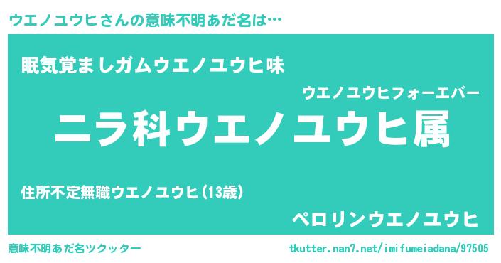 | 女子向けラノベタイトル風あだ名 | 『ウエノユウヒの玉の輿計画!』 |