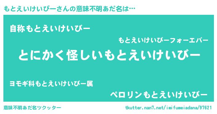 | 女子向けラノベタイトル風あだ名 | 『もとえいけいびーの卵を拾いまして』 |