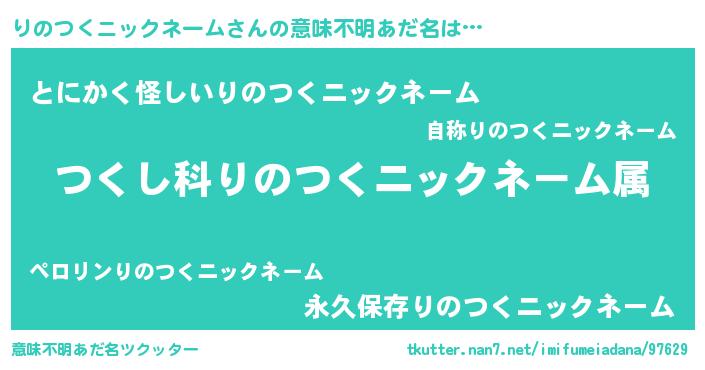 | 男性向けラノベタイトル風あだ名 | 『りのつくニックネーム~年齢イコール彼女いない歴の魔法使い~』 |