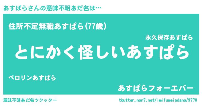 | 男性向けラノベタイトル風あだ名 | 『ダンジョンにあすぱらを求めるのは間違っているだろうか』 |