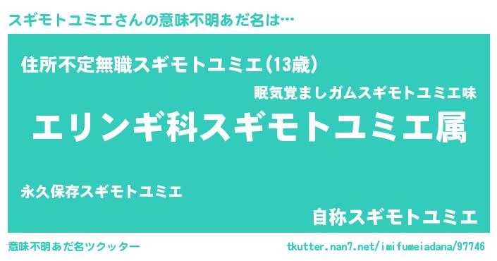 | 男性向けラノベタイトル風あだ名 | 『スギモトユミエスレイヤー』 |
