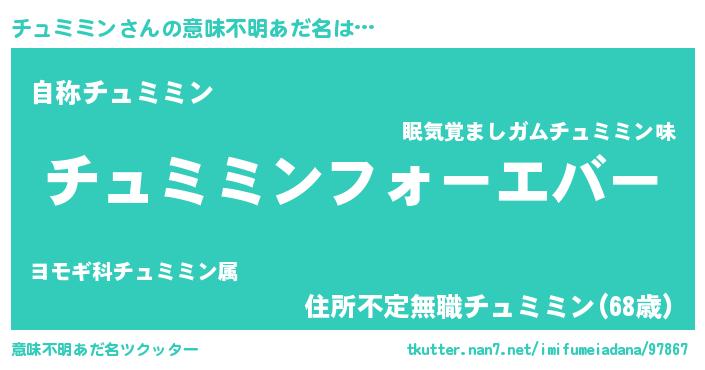 | 男性向けラノベタイトル風あだ名 | 『やはりチュミミンの青春ラブコメはまちがっている 』 |