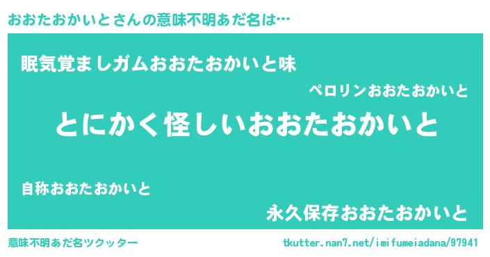 | 男性向けラノベタイトル風あだ名 | 『おおたおかいとの嫁は女の子じゃないと思った?』 |