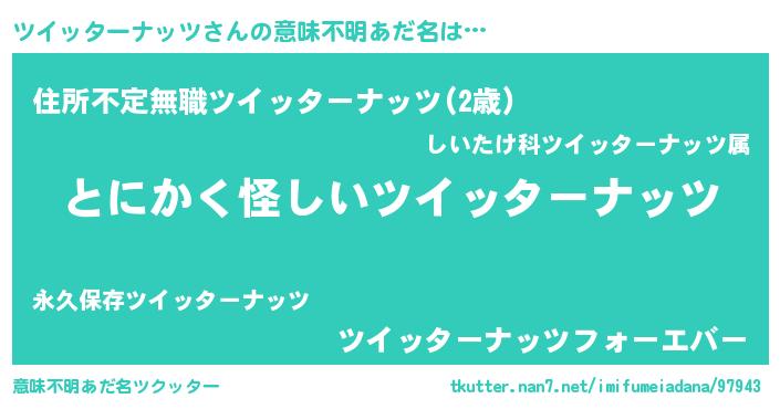 | 男性向けラノベタイトル風あだ名 | 『ツイッターナッツの嫁は女の子じゃないと思った?』 |