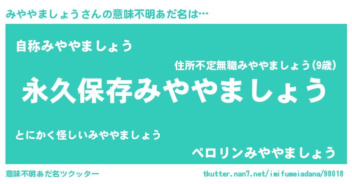 | 胡散臭い通販商品みたいなあだ名 | 『絶対に幸福をもたらす水素水…その名も「みややましょう」』 |