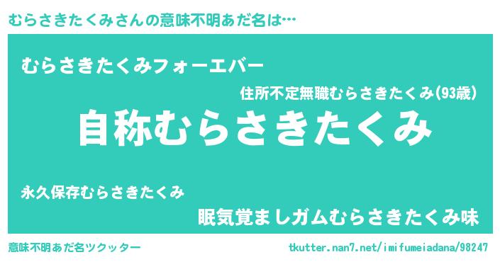 | 男性向けラノベタイトル風あだ名 | 『Re:むらさきたくみから始める異世界生活』 |