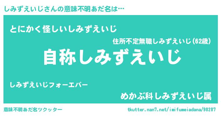 | 男性向けラノベタイトル風あだ名 | 『Re:しみずえいじから始める異世界生活』 |