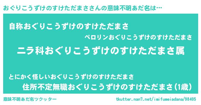 | 男性向けラノベタイトル風あだ名 | 『おぐりこうずけのすけただまさ~年齢イコール彼女いない歴の魔法使い~』 |