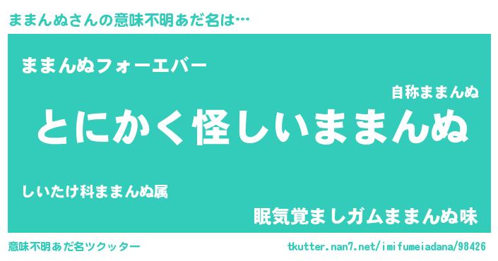 | 女子向けラノベタイトル風あだ名 | 『ままんぬの卵を拾いまして』 |