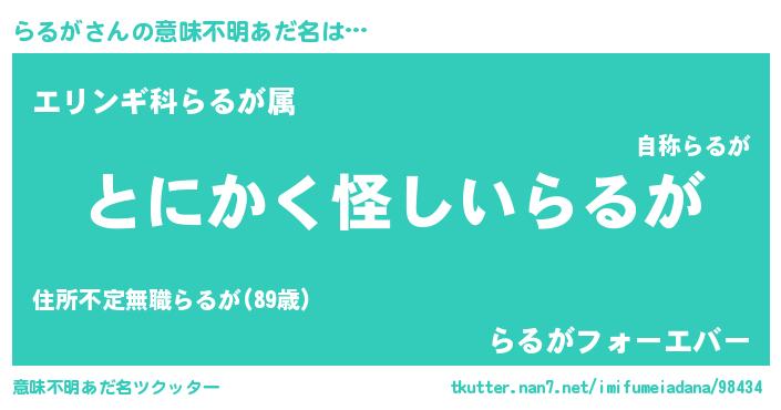 | 胡散臭い通販商品みたいなあだ名 | 『信頼と実績のサプリメント…その名も「らるが」』 |