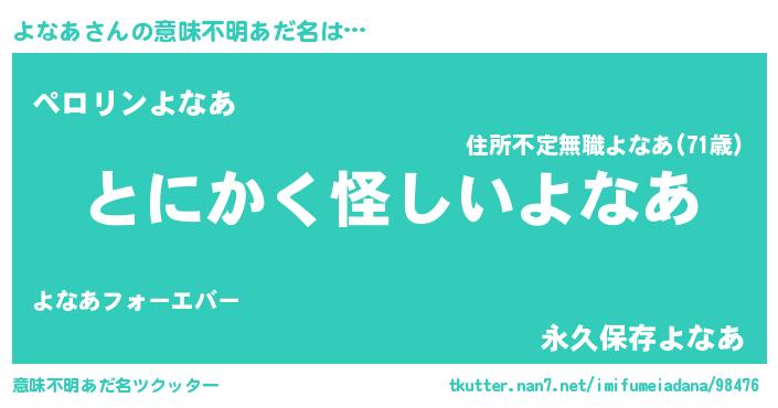 | 男性向けラノベタイトル風あだ名 | 『よなあの嫁は女の子じゃないと思った?』 |