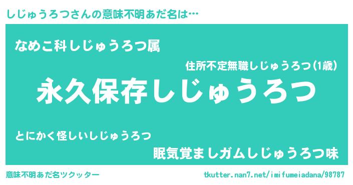 | 男性向けラノベタイトル風あだ名 | 『しじゅうろつという概念が存在しない退屈な世界 』 |