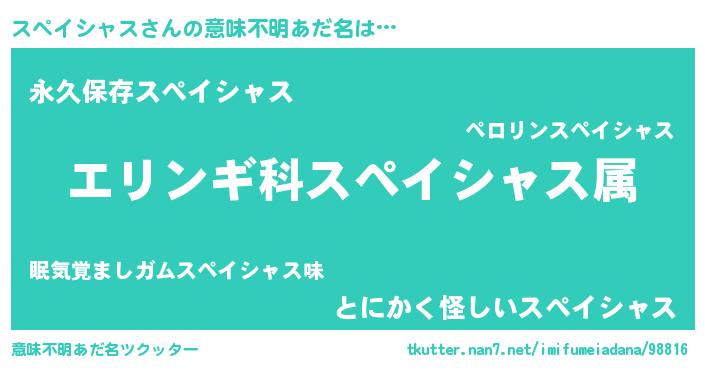 | 胡散臭い通販商品みたいなあだ名 | 『絶対に幸福をもたらす水素水…その名も「スペイシャス」』 |