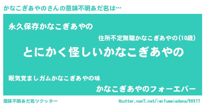 | 男性向けラノベタイトル風あだ名 | 『かなこぎあやのの嫁は女の子じゃないと思った?』 |