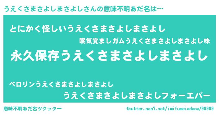 | 胡散臭い通販商品みたいなあだ名 | 『来世でも幸せになれる健康食品…その名も「うえくさまさよしまさよし」』 |