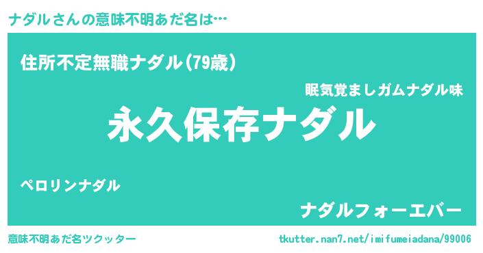 | 女子向けラノベタイトル風あだ名 | 『異世界で失敗しない100のナダル』 |