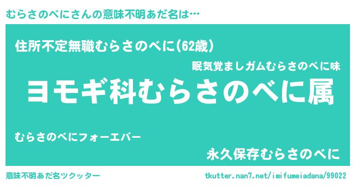 | 男性向けラノベタイトル風あだ名 | 『むらさのべに~年齢イコール彼女いない歴の魔法使い~』 |