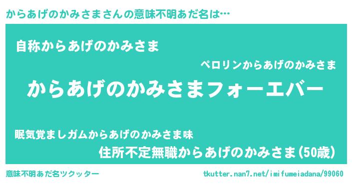 | 男性向けラノベタイトル風あだ名 | 『やはりからあげのかみさまの青春ラブコメはまちがっている 』 |